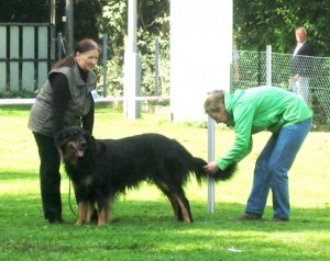 Offenbar durch ein Missverständnis drehte die Halterin des zweitplatzierten Rüdens (Hund und Halterin waren das 1. Mal auf einer Ausstellung), die sich bereits zwischen dem 3. und 4. Platz befand, mit ihrem Rüden um, da sie – jetzt mit dem Uhrzeigersinn laufend – auf den 2. Platz zurücklaufen wollte. Die nun aufeinander zulaufenden, etwa gleichaltrigen Rüden (ich lief mit Leo nur wenige Meter dahinter) fixierten sich sogleich, was dann die sehr kurze unblutige Rangelei auslöste, da ich – von der Situation überrascht – die Leine nicht sofort ausreichend verkürzen konnte.