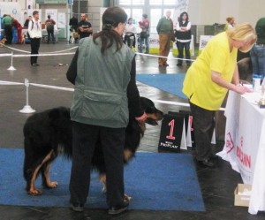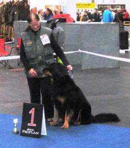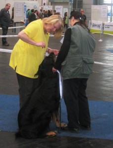 Am 26.10.2013 “versuchte” ich mich erneut mit Leo auf einer Ausstellung. Zur CACIB Hannover war der Anfahrtsweg dann auch recht überschaubar. Kaum angekommen, bekam Leo die Nase kaum noch vom Boden, da offenbar eine Reihe von läufigen Hündinnen unterwegs war. Auch bei den vor uns in unserem Ring beurteilten Neufundländern schien eine läufige Hündin dabei gewesen zu sein. Mit den Zähnen klappernd und sabbernd ließ Leo sich nur ungern “überzeugen”, sich für die Beurteilung “ordentlich” hinzusetzen/-zustellen.