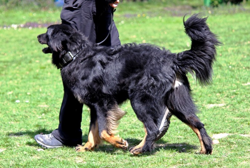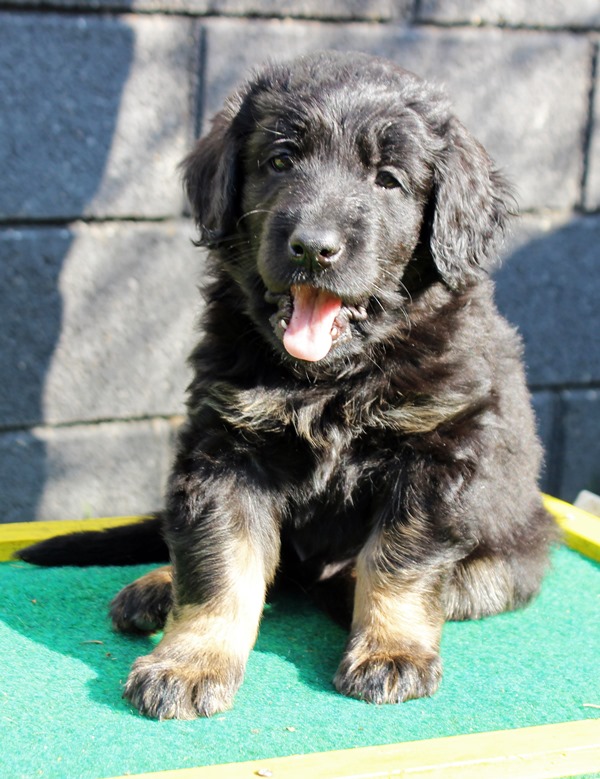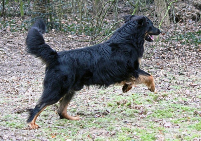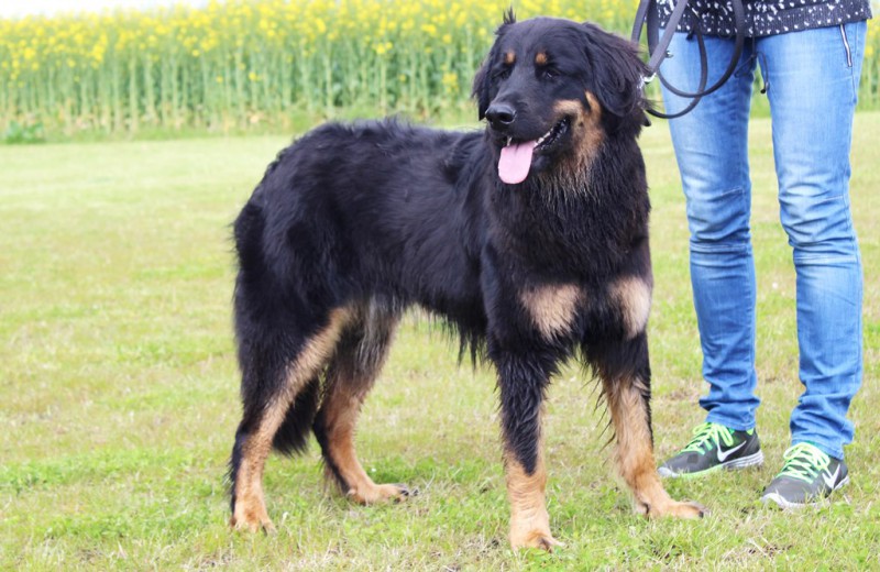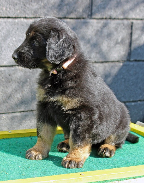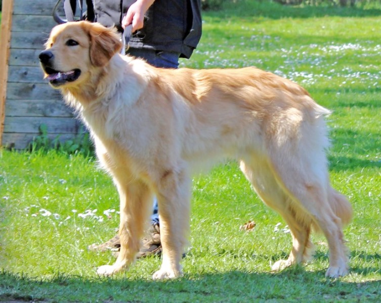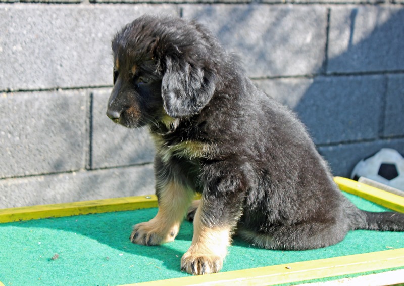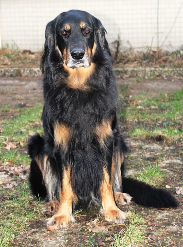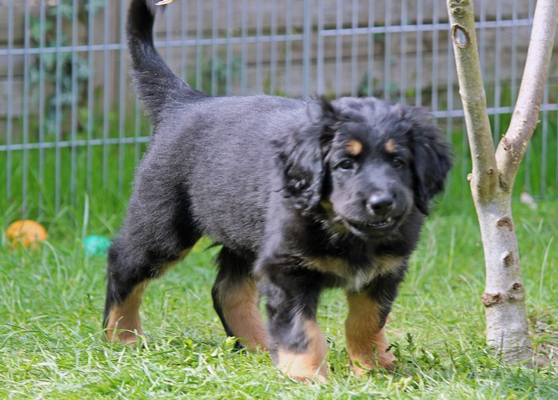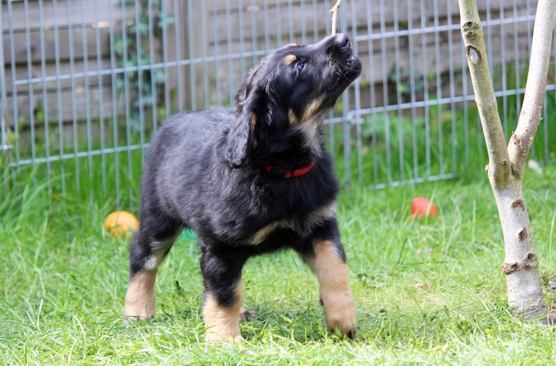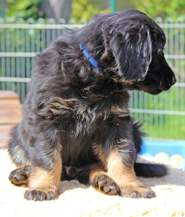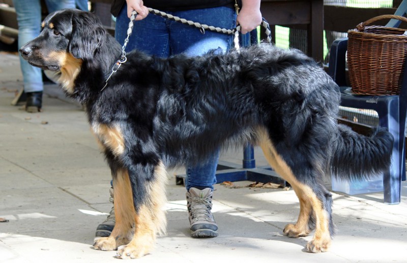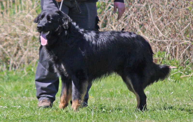 “Ein 2 Jahre alter kräftiger, harmonisch aufgebauter Rüde, kräftiger Rüdenkopf. korrekt angesetzte Ohren, gerade feste Rückenlinie, komplettes Scherengebiss, mittelbraunes Auge, gold-braune Markenzeichnung, am Fang etwas verwaschen, vorzügliche Fellstruktur und -länge, korrekte Rute, Hoden vorhanden, korrekte Winkelung in der Hinterhand, gut entwickelte Brustbreite und -tiefe, etwas weich im Vorderfußwurzelgelenk, in der Bewegung in der Hinterhand leicht hackeneng, in der Vorderhand leicht ausgestellt. In der Kreisbewegung flüssiges Gangwerk, sehr schöne Rutenhaltung, freundlich und gelassen.”
