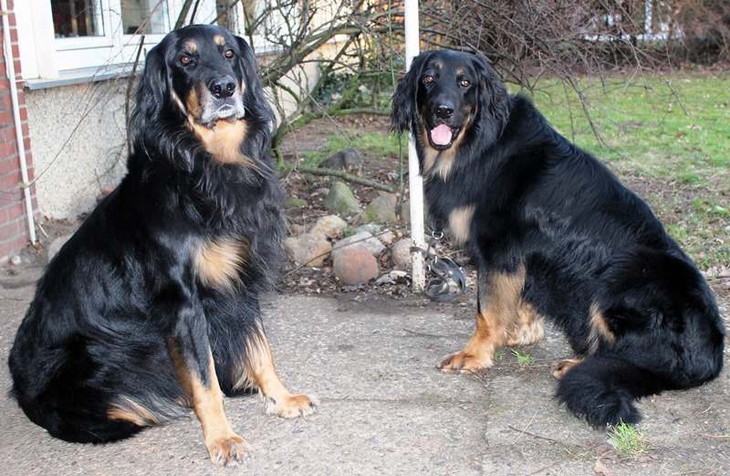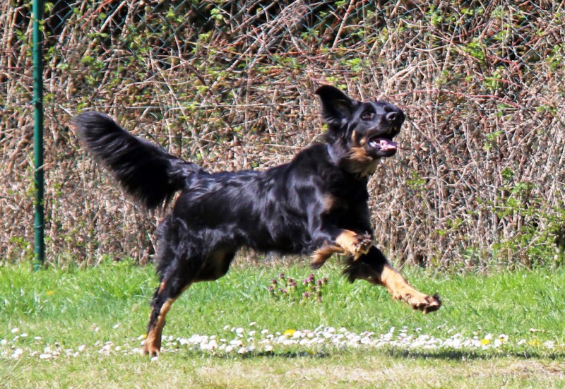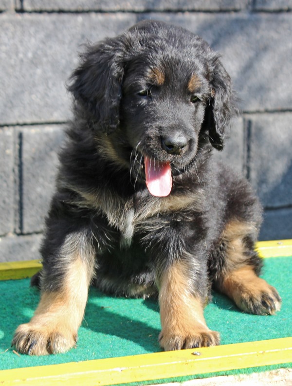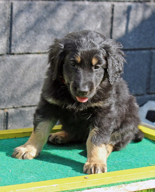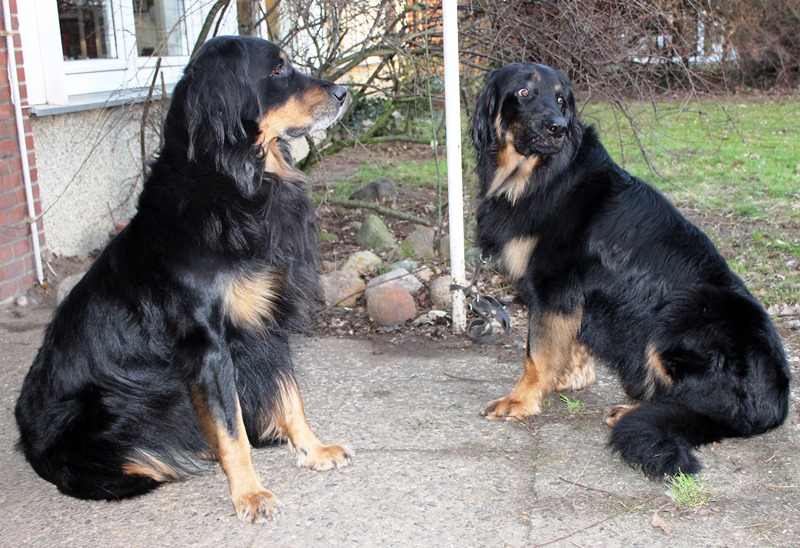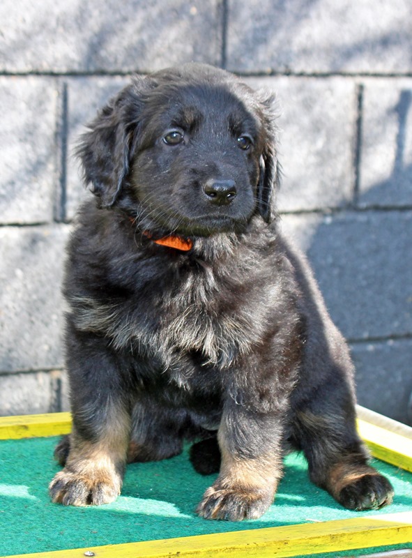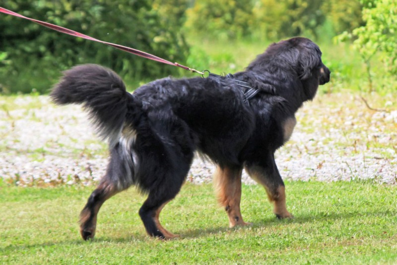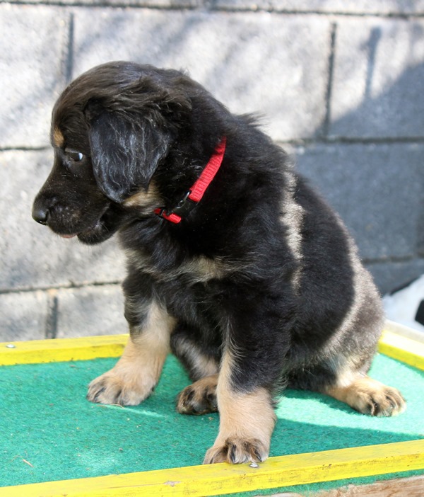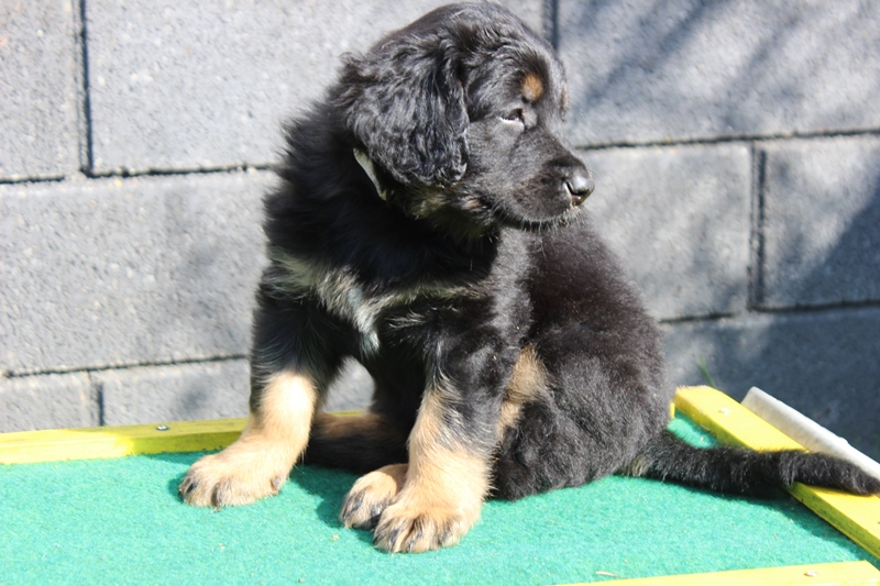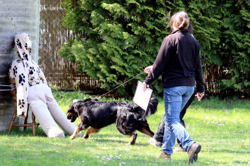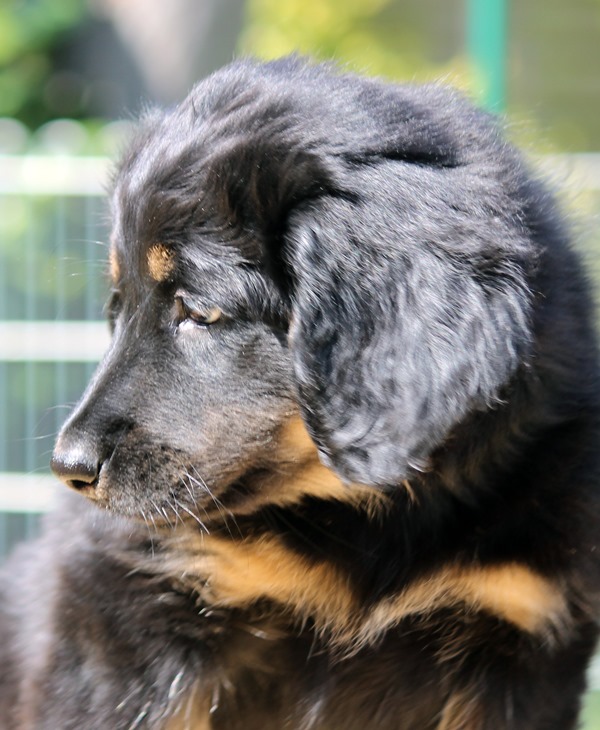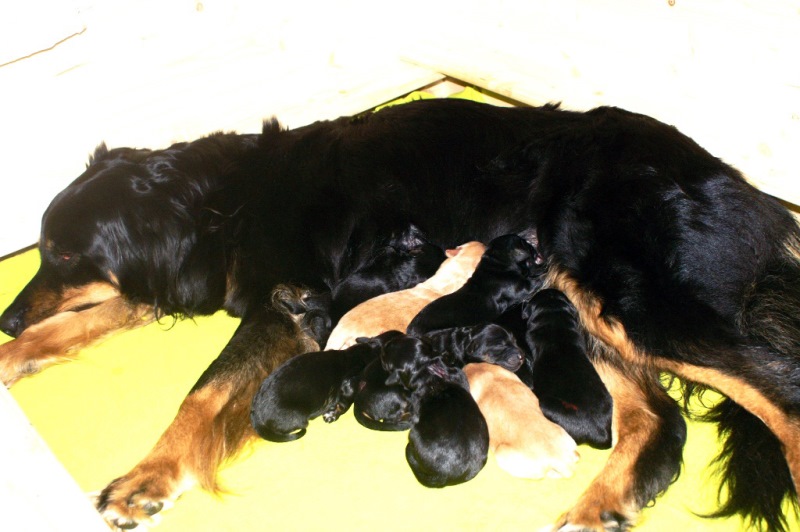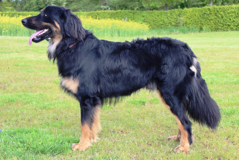 “Ein 2 Jahre alter kräftiger, harmonisch aufgebauter Rüde, kräftiger Rüdenkopf. korrekt angesetzte Ohren, gerade feste Rückenlinie, komplettes Scherengebiss, mittelbraunes Auge, gold-braune Markenzeichnung, am Fang etwas verwaschen, vorzügliche Fellstruktur und -länge, korrekte Rute, Hoden vorhanden, korrekte Winkelung in der Hinterhand, gut entwickelte Brustbreite und -tiefe, etwas weich im Vorderfußwurzelgelenk, in der Bewegung in der Hinterhand leicht hackeneng, in der Vorderhand leicht ausgestellt. In der Kreisbewegung flüssiges Gangwerk, sehr schöne Rutenhaltung, freundlich und gelassen.”
