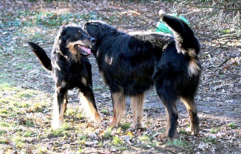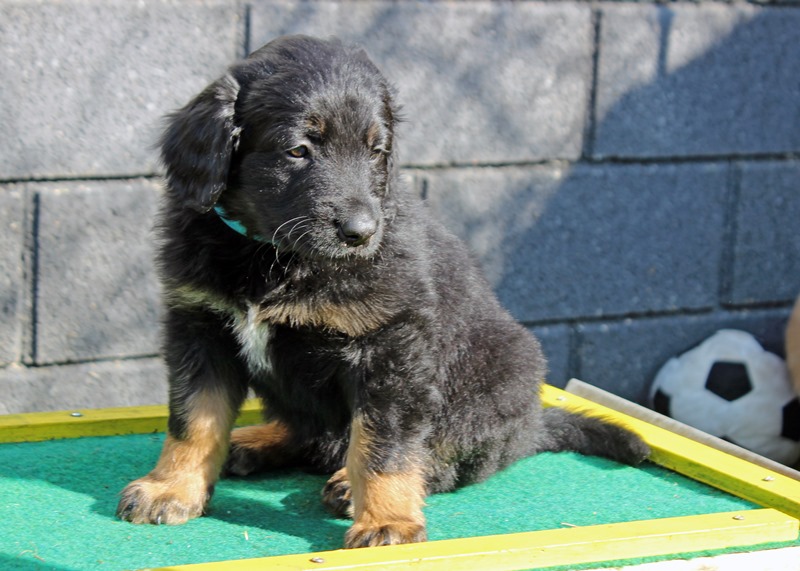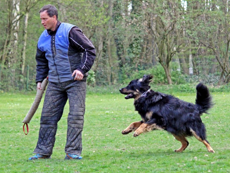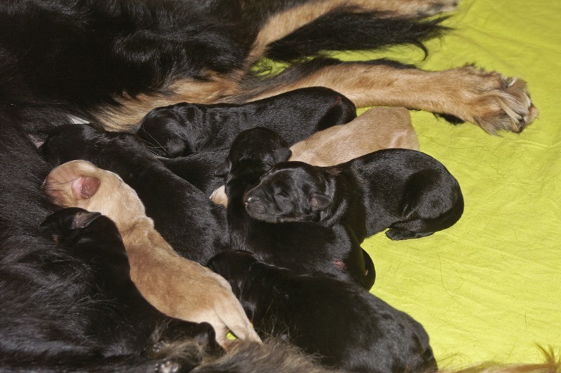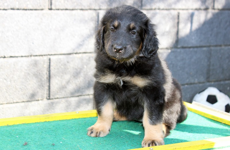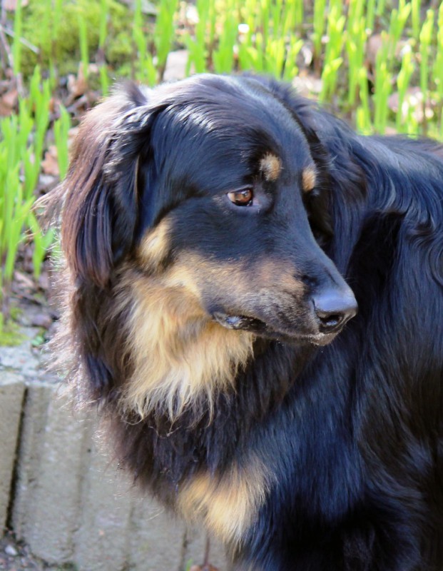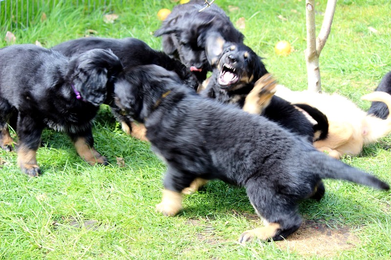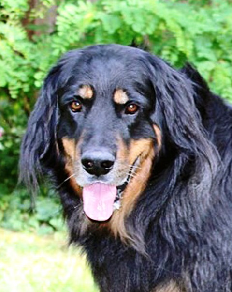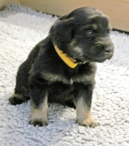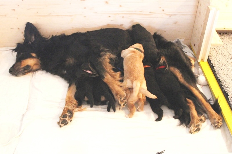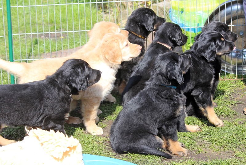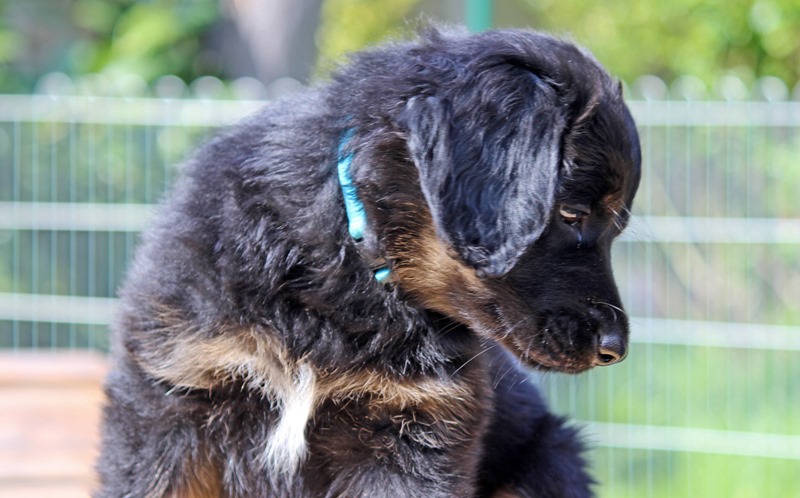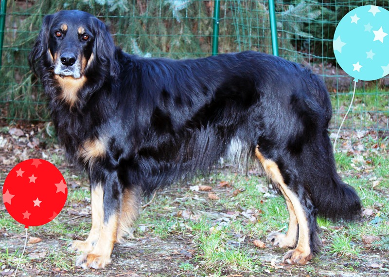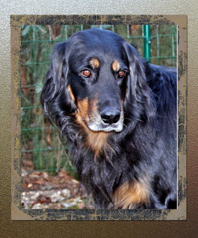 “Ein 2 Jahre alter kräftiger, harmonisch aufgebauter Rüde, kräftiger Rüdenkopf. korrekt angesetzte Ohren, gerade feste Rückenlinie, komplettes Scherengebiss, mittelbraunes Auge, gold-braune Markenzeichnung, am Fang etwas verwaschen, vorzügliche Fellstruktur und -länge, korrekte Rute, Hoden vorhanden, korrekte Winkelung in der Hinterhand, gut entwickelte Brustbreite und -tiefe, etwas weich im Vorderfußwurzelgelenk, in der Bewegung in der Hinterhand leicht hackeneng, in der Vorderhand leicht ausgestellt. In der Kreisbewegung flüssiges Gangwerk, sehr schöne Rutenhaltung, freundlich und gelassen.”