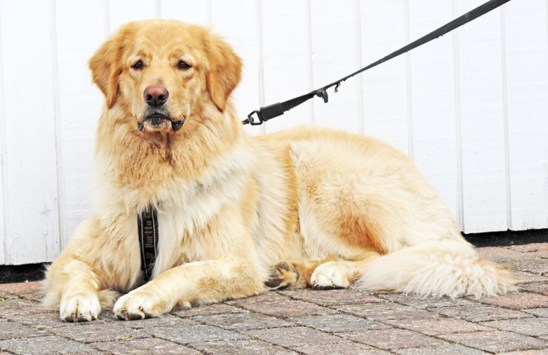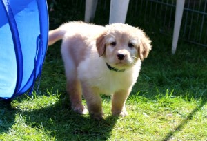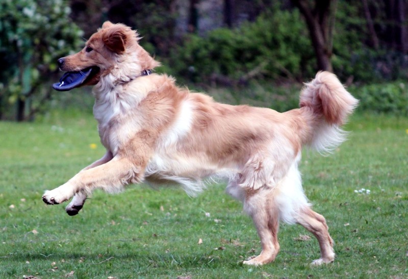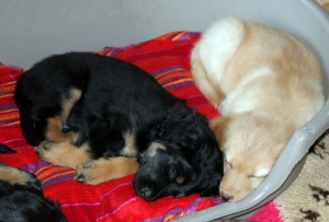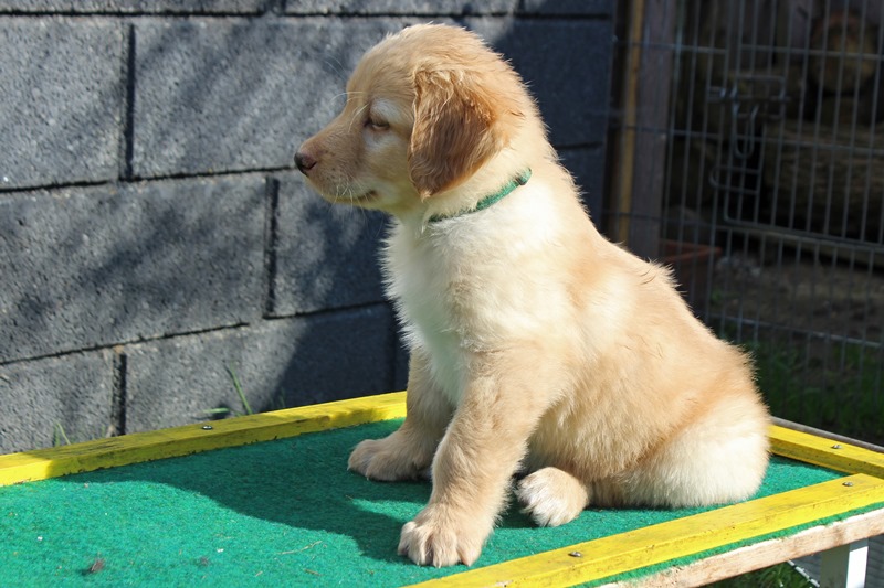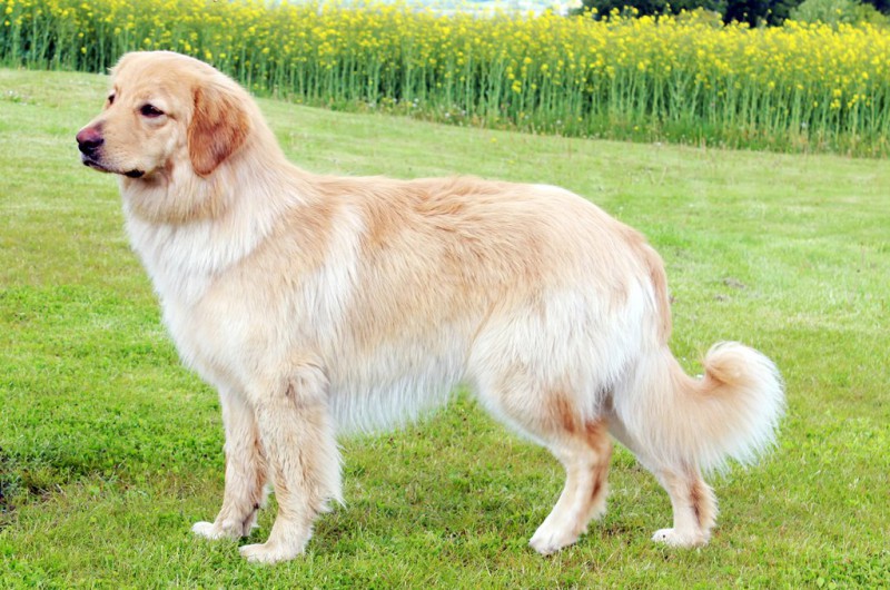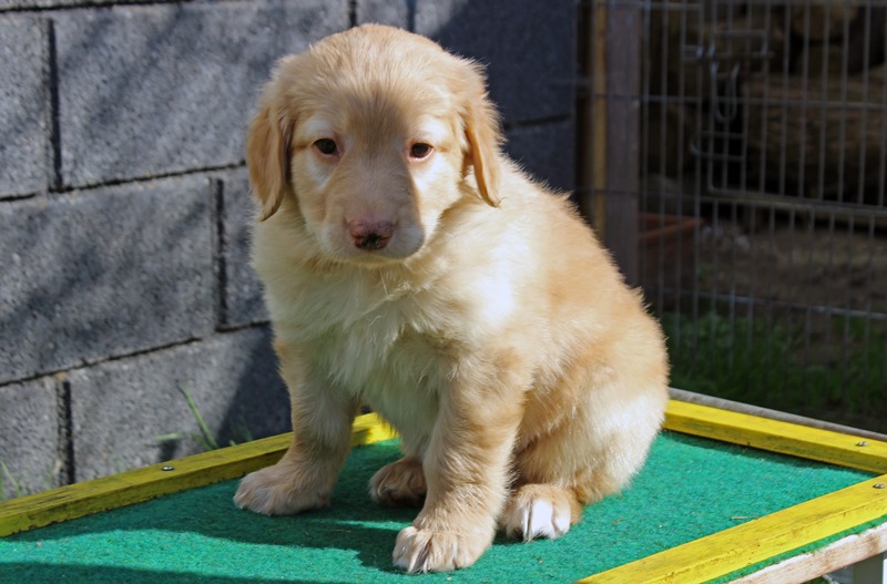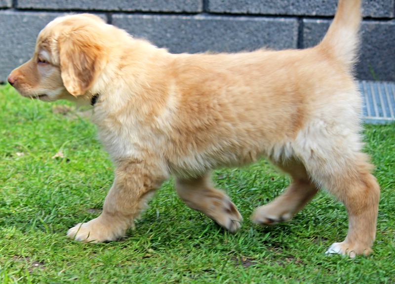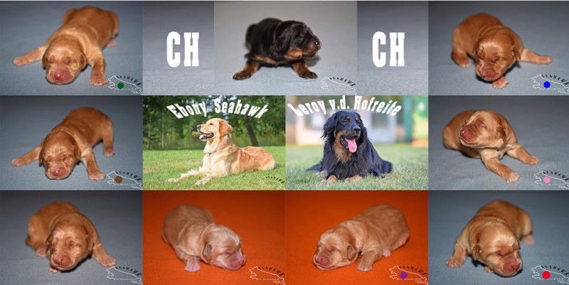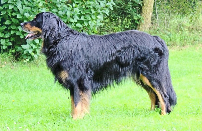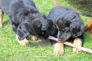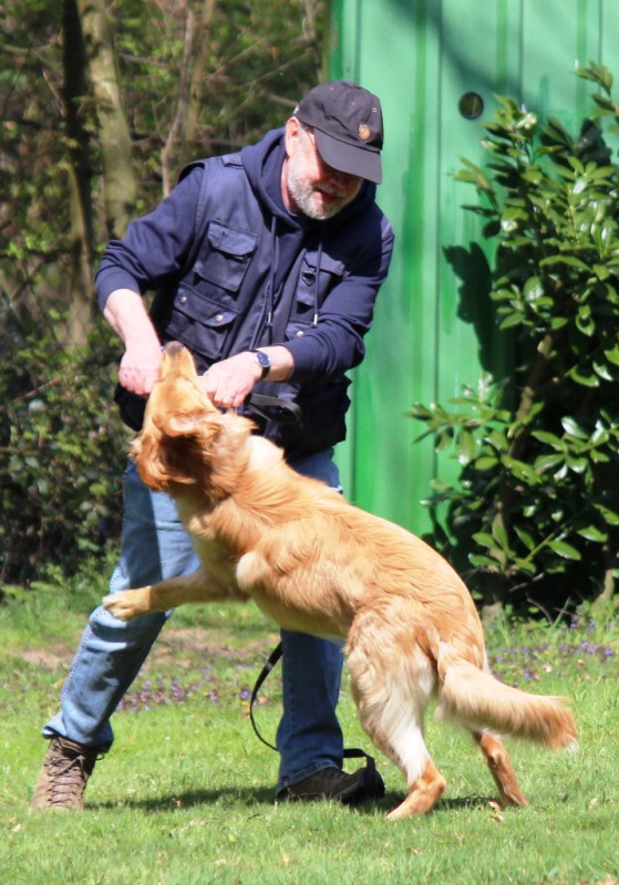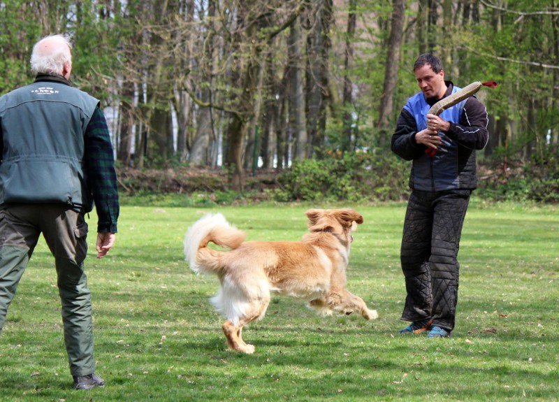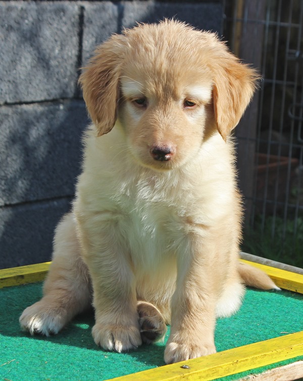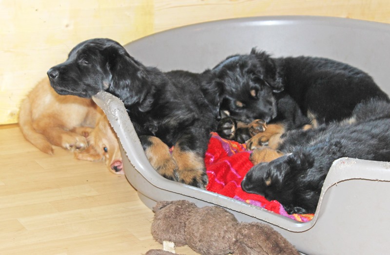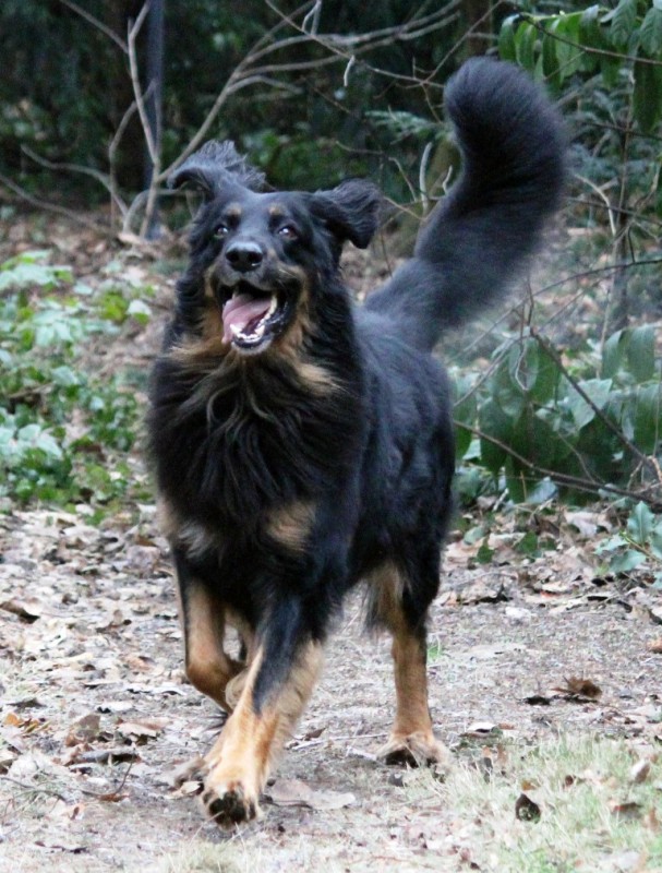 “Ein 2 Jahre alter kräftiger, harmonisch aufgebauter Rüde, kräftiger Rüdenkopf. korrekt angesetzte Ohren, gerade feste Rückenlinie, komplettes Scherengebiss, mittelbraunes Auge, gold-braune Markenzeichnung, am Fang etwas verwaschen, vorzügliche Fellstruktur und -länge, korrekte Rute, Hoden vorhanden, korrekte Winkelung in der Hinterhand, gut entwickelte Brustbreite und -tiefe, etwas weich im Vorderfußwurzelgelenk, in der Bewegung in der Hinterhand leicht hackeneng, in der Vorderhand leicht ausgestellt. In der Kreisbewegung flüssiges Gangwerk, sehr schöne Rutenhaltung, freundlich und gelassen.”