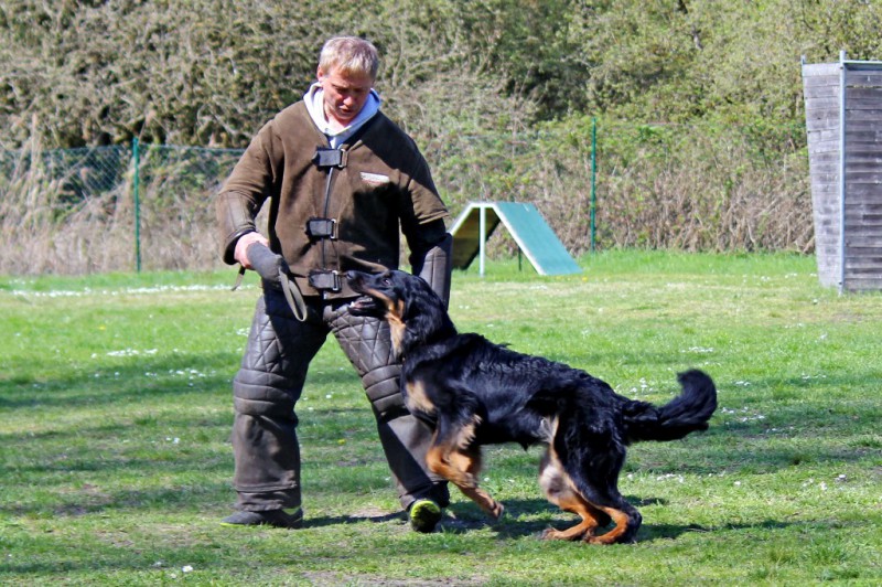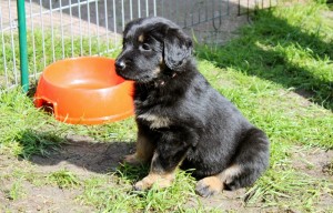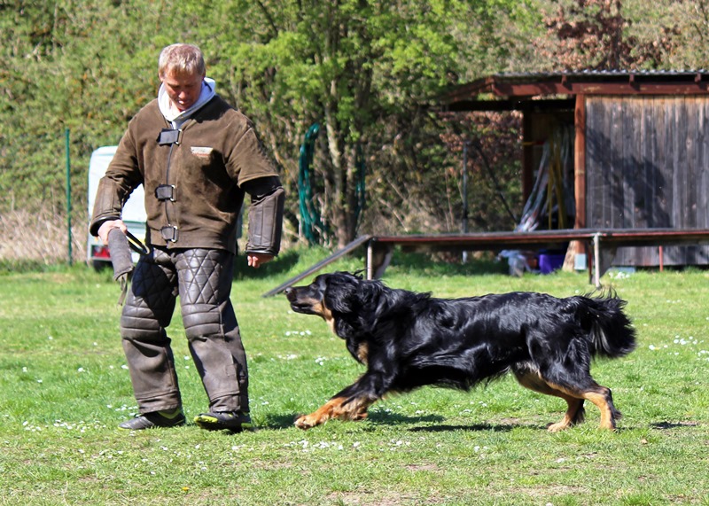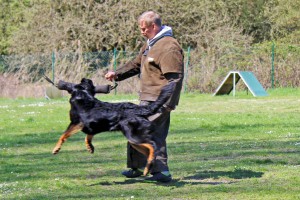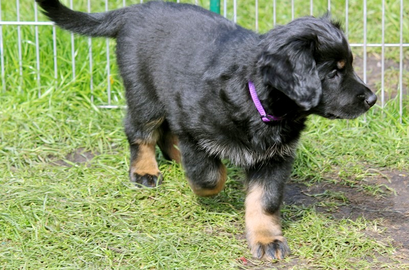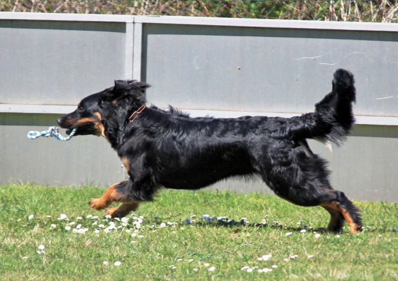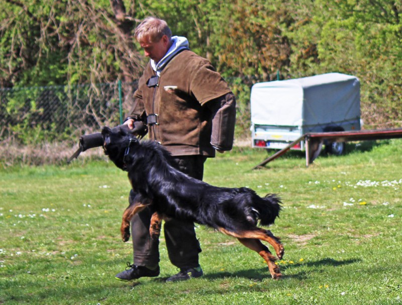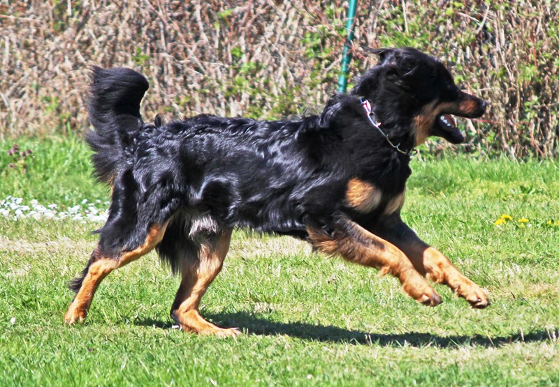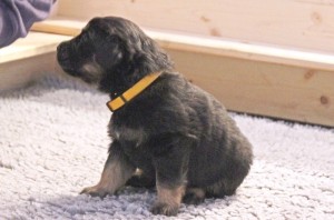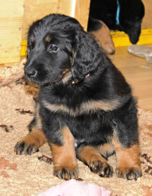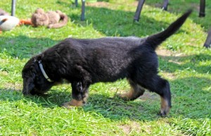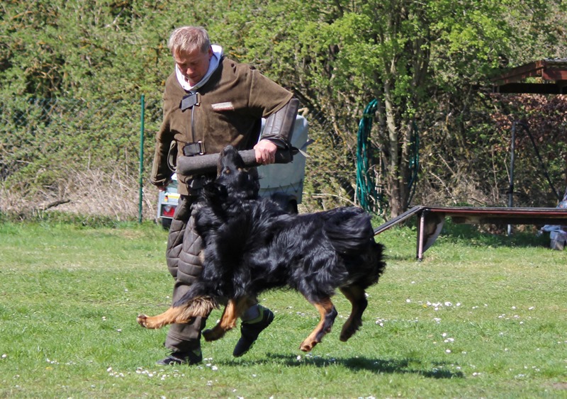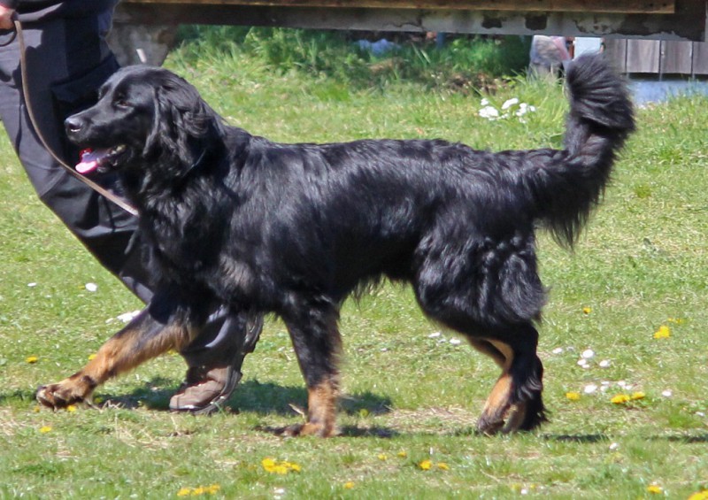 “Ein 2-jähriger, gut mittelgroßer, gut mittelkräftiger schwarzmarkener Rüde, typvoller Kopf, mittelbraune Augen, in allen Belangen korrekte Ohren, vollzähliges Scherengebiss, offene Lefzen, Hoden vorhanden. Das schlichte, tiefschwarze Haarkleid in korrekter Länge, Markenzeichnung komplett und mittelblond, etwas verwaschen an den Läufen, kleiner weißer Brustfleck. Im Stand insgesamt korrekte Winkelungen, in der Bewegung in der Vorhand paddelnd, Hinterhand eng. Sehr schöner flüssiger Trab im Kreis, Rute in allen Belangen ausgezeichnet. Sehr freundlicher Rüde.”