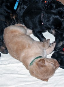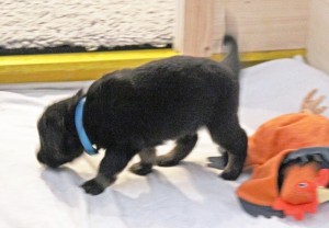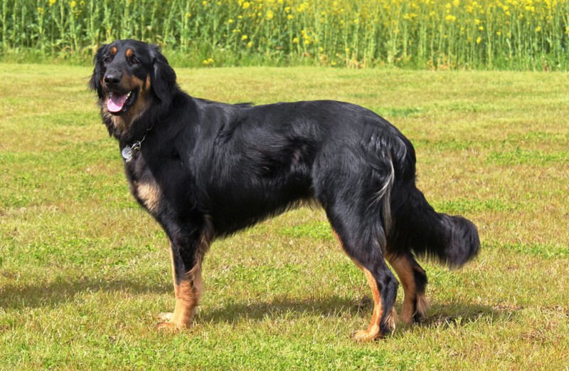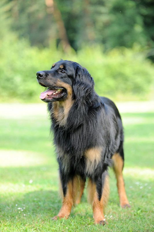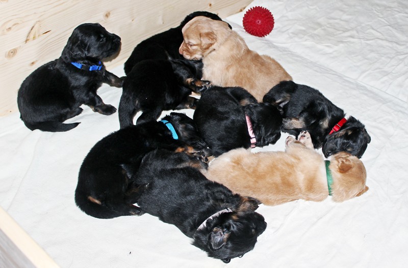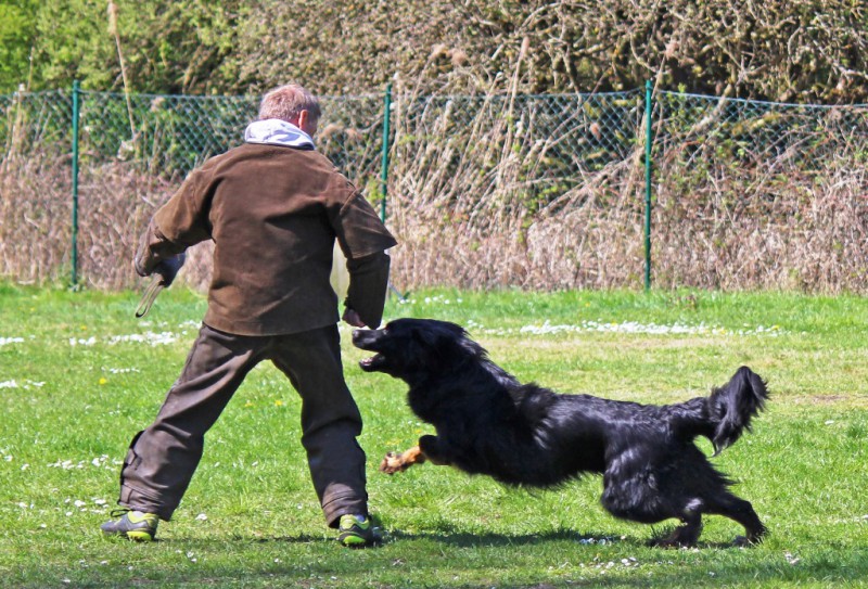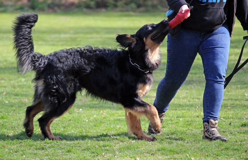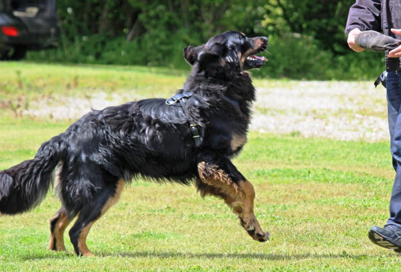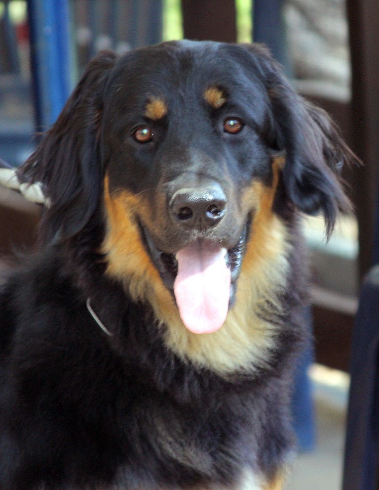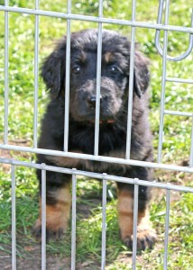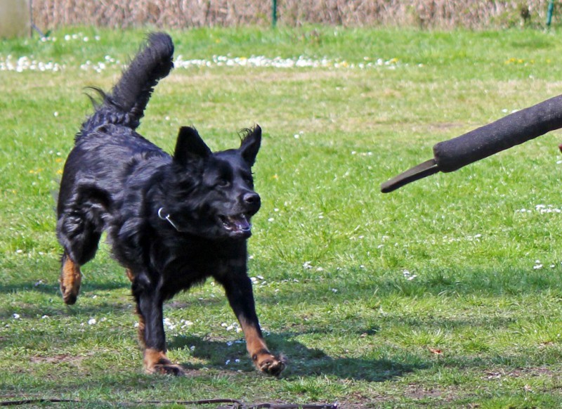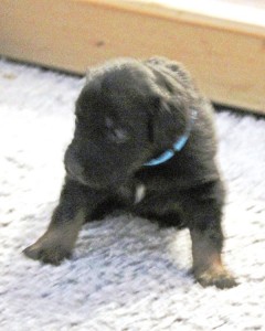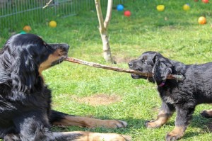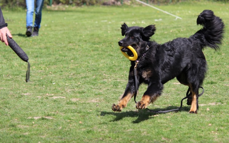 “Ein 2-jähriger, gut mittelgroßer, gut mittelkräftiger schwarzmarkener Rüde, typvoller Kopf, mittelbraune Augen, in allen Belangen korrekte Ohren, vollzähliges Scherengebiss, offene Lefzen, Hoden vorhanden. Das schlichte, tiefschwarze Haarkleid in korrekter Länge, Markenzeichnung komplett und mittelblond, etwas verwaschen an den Läufen, kleiner weißer Brustfleck. Im Stand insgesamt korrekte Winkelungen, in der Bewegung in der Vorhand paddelnd, Hinterhand eng. Sehr schöner flüssiger Trab im Kreis, Rute in allen Belangen ausgezeichnet. Sehr freundlicher Rüde.”