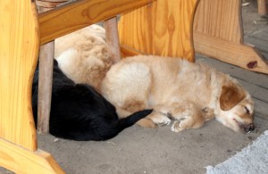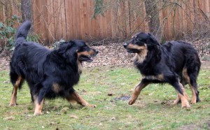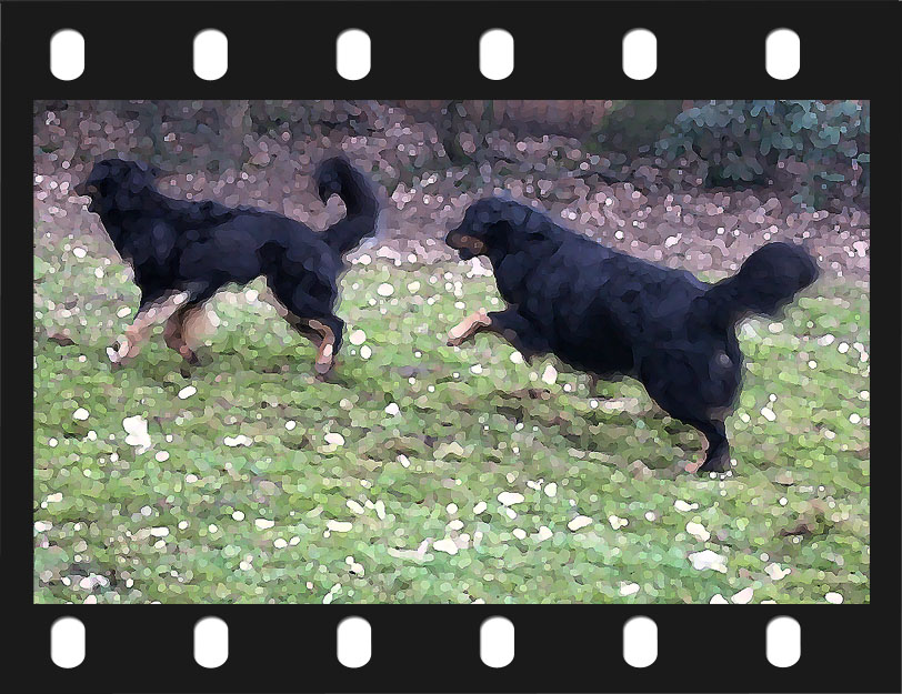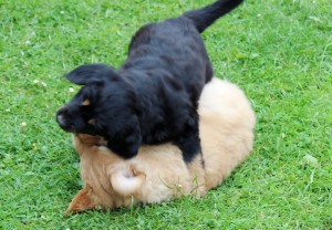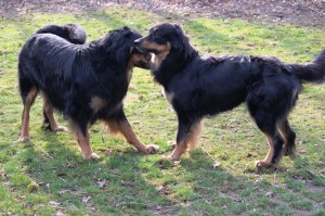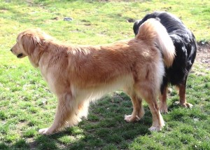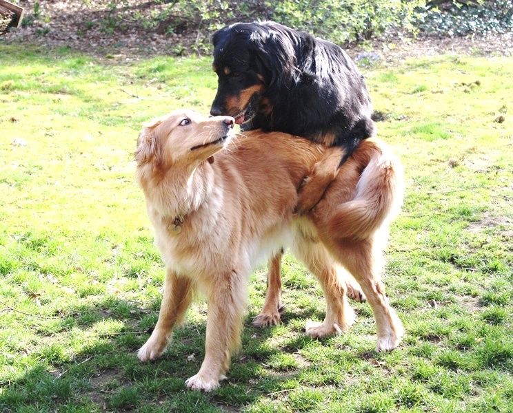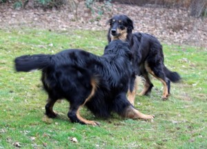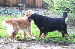 Für mich sehr beeindruckend war die Ähnlichkeit im Verhalten der beiden Hündinnen Josy und Inka, die beide ganz “vernarrt” in Leo wirkten und beide – kaum im Garten – sich sogleich auf die Suche nach Leo begaben (ähnlich wie vor ca. 1 Jahr “Susa vom Campemoor” – P-Wurf von Arminius). Beide hielten sich am 2. Decktag nicht mit weiterem Markieren auf, sondern “forderten” regelrecht das erneute Treffen mit Leo. Ich bin überzeugt, dass die deutliche Ähnlichkeit der Hündinnen im Verhalten, die ausgeprägte Sympathie zwischen ihnen und Leo und die “perfekt” wirkenden natürlichen Deckakte ohne jegliches Einwirken von Seiten der Menschen eine starke genetische Komponente haben – die Hunde konnten sich ganz offensichtlich “sehr gut riechen”. Die nahe Verwandtschaft von Susa, Inka und Josy spricht sicher auch für eine ähnliche Genetik im Hinblick auf das Deckverhalten. So ist Inkas Mutter “Alpha vom Bergischen Löwen” sowohl die Großmutter von Susa als auch von Josy.