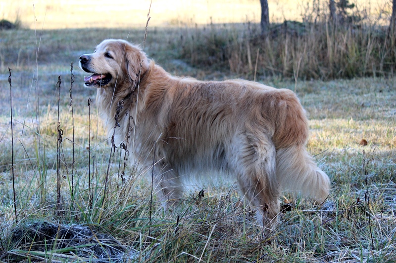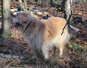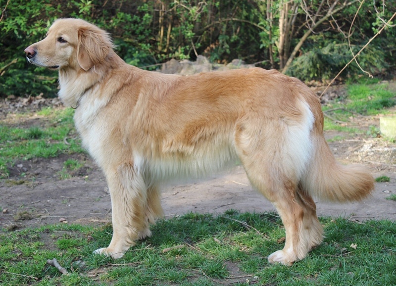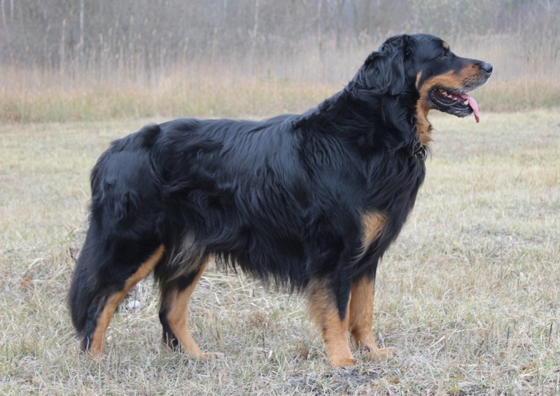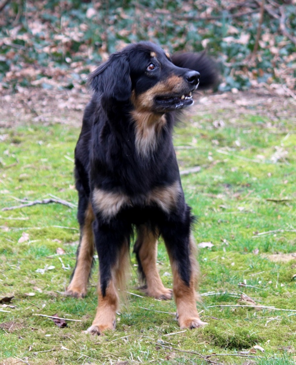 Knapp 4 J. alter kräftiger sm-Rüde mit typischem Kopf, korrekt angesetztem Behang, mittelbraunen Augen, vollständigem Scherengebiss und etwas offenen Lefzen. Das Gebäude ist gestreckt, die Rute ist in Ordnung, die Hoden sind vorhanden. Das Haarkleid ist ausreichend lang und leicht gewellt. Die mittelblonde Markenzeichnung ist vollständig. Die Läufe sind gerade und korrekt gewinkelt. Der Rüde zeigt einen gleichmäßigen Trab mit einwandfreier Rutenhaltung. Allein im Ring ist er interessiert und freundlich. (CACIB Hannover am 26.10.2013, Zuchtrichterin: R. Rückbrecht – Offene Klasse: V1, BOB, CACIB, CAC, Anw. Dt. Champion VDH).