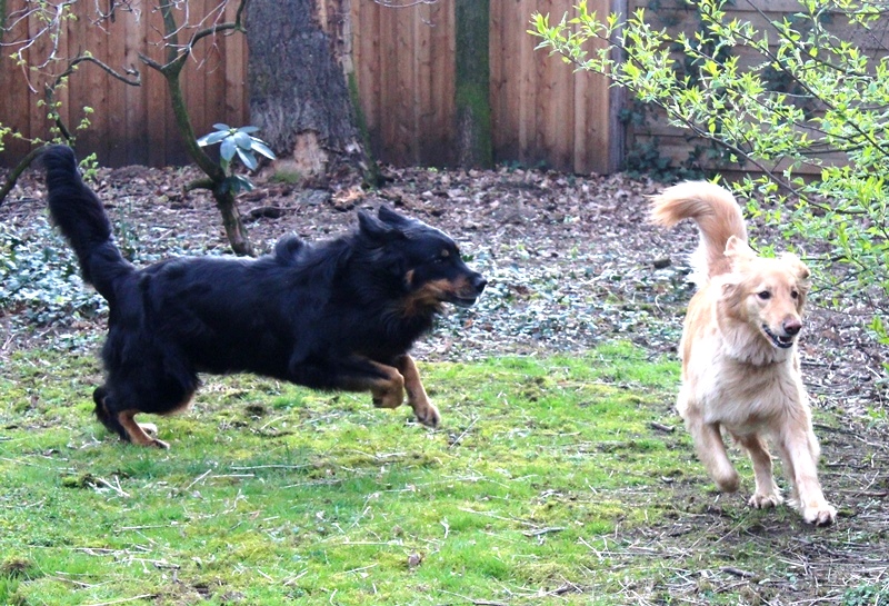 Am 03. und 04. März 2014 wurde Inka vom Teckenhahn von Leo in Windeseile gedeckt. Dauerte das Vorspiel am ersten Tag “noch” ca. 5 Minuten, so “verschwendeten” die beiden am zweiten Tag dafür kaum noch Zeit, sondern waren bereits nach ca. 3 Minuten zum Deckakt bereit. Inka, die zunächst alleine in den Garten gelassen wurde, hatte am 2. Tag nicht einmal mehr Zeit, Markierungen zu setzen, so als wollte sie sagen “das habe ich doch schon gestern erledigt”. Sie blieb stattdessen nach wenigen Sekunden wie angewurzelt vor der Terrasse stehen, blickte in die Richtung, aus der Leo kommen würde: