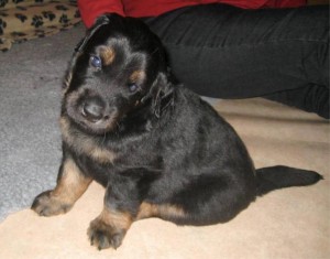 Wurfabnahme am 05.04.13: Archie Cute hat eine komplette, sehr schöne mittelblonde Markenzeichnung, einen mittelkräftigen Körperbau mit passendem Kopf, das Haarkleid ist von guter Struktur und Länge. Er hat gute Gelenkwinkelungen. Ohren und Rute zeigen eine korrekte Länge, Anomalien der Rute sind nicht feststellbar; er hat ein Scherengebiss, beide Hoden sind tastbar. Er ist freundlich, neugierig und z. Zt. zeigt er ein ruhiges Temperament.